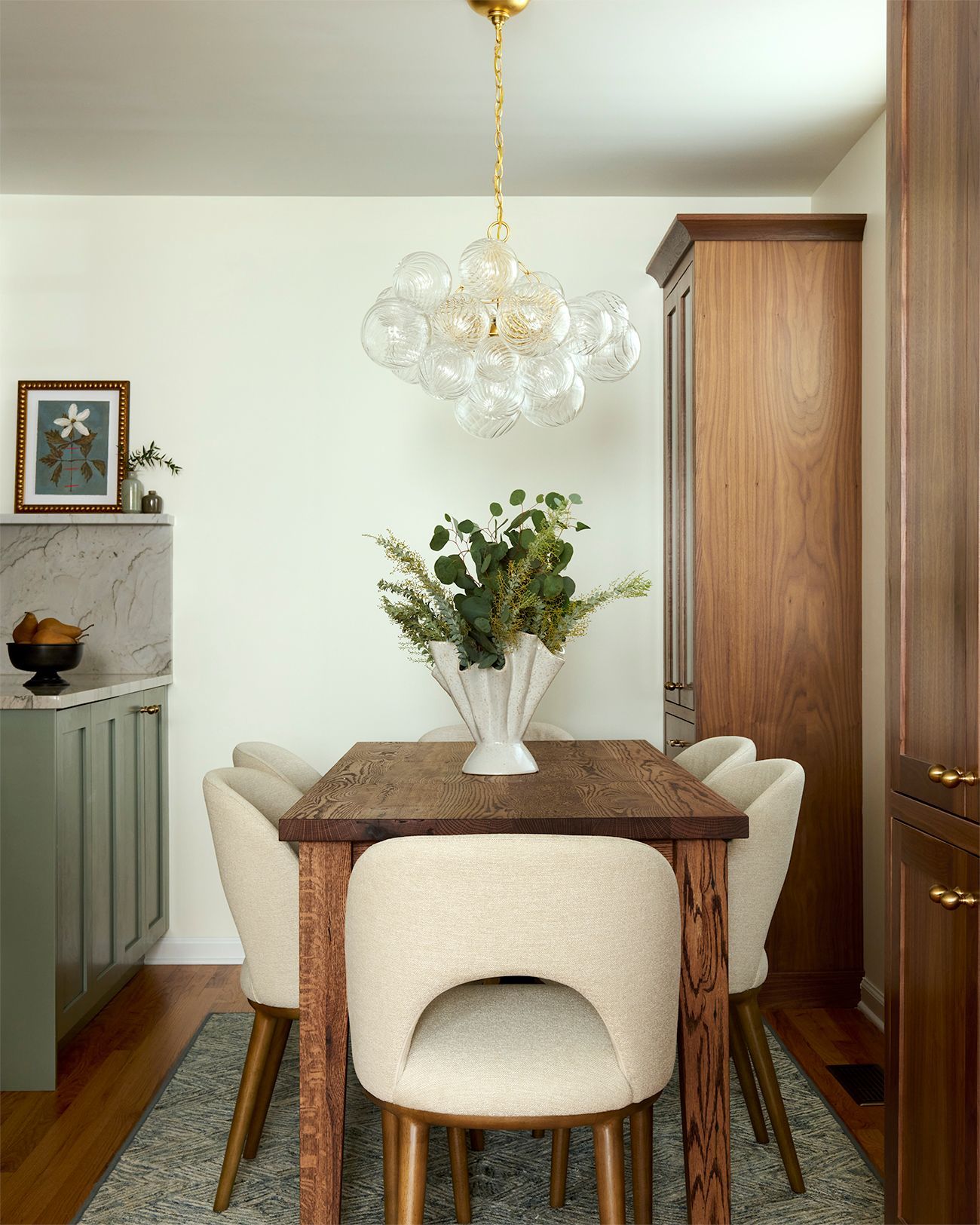 The dining room, living room and kitchen are all open to one another, so a cohesive interior was important to our client. Our designer Kristie did full service interior decorating to tie it all together. Custom walnut cabinetry in the dining room adds storage without the kitchen cabinetry blending into the dining room. New furniture, fixtures and art throughout give our client a fresh look when she comes home. The old fireplace wasn't working right, so we fixed that problem and gave it a style upgrade as well with a new mantle and surround.